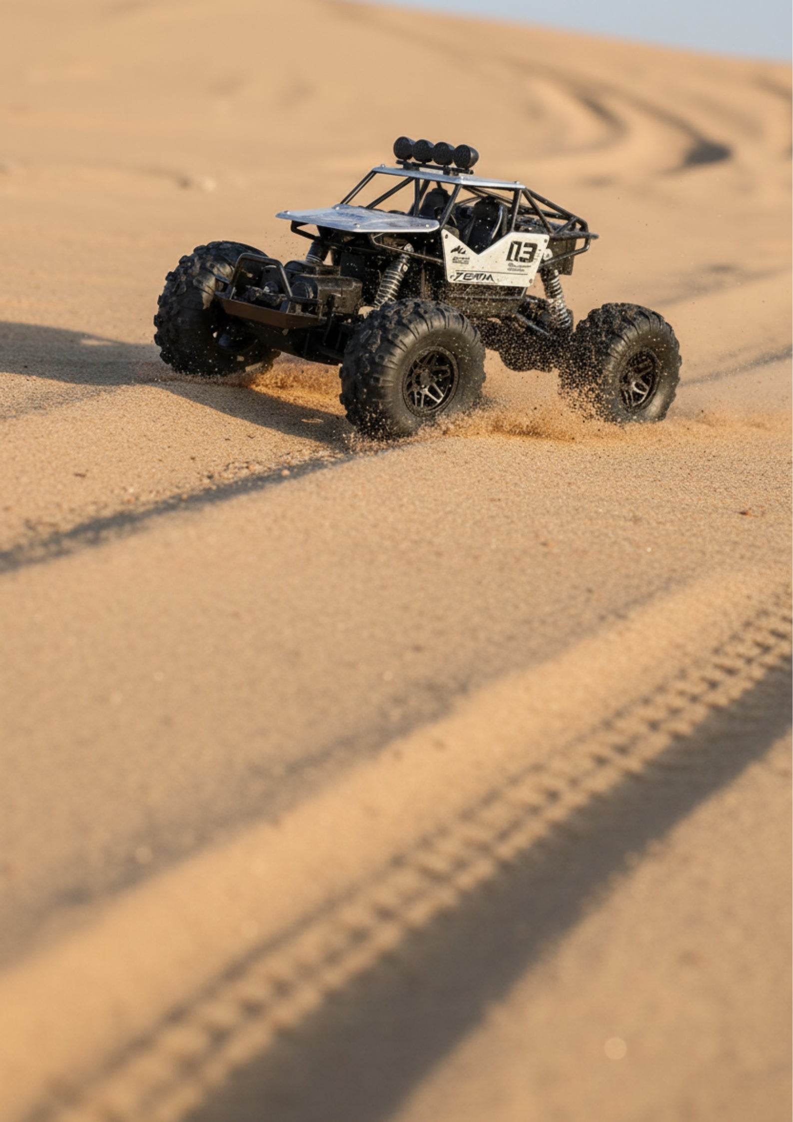 Le 4x4 qui encaisse tout sans broncher. Avec son châssis métallique renforcé, ses suspensions hydrauliques et ses roues anti-renversement, ce bolide à 50 km/h est conçu pour résister à l'énergie débordante des jeunes pilotes. Sable, boue, herbe, cailloux : ses pneus sculptés et sa protection IPX4 lui permettent d'affronter tous les terrains, même mouillés.